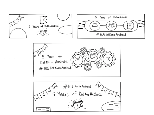 I proposed using high-five as a visual element and the Kotlin logo as inspiration for a celebratory pennant banner. I presented four design concepts to the team.