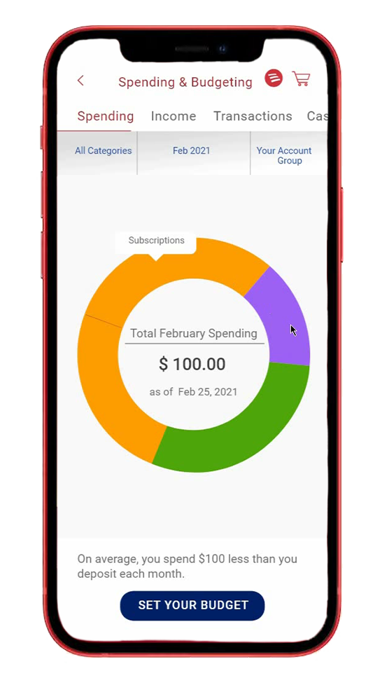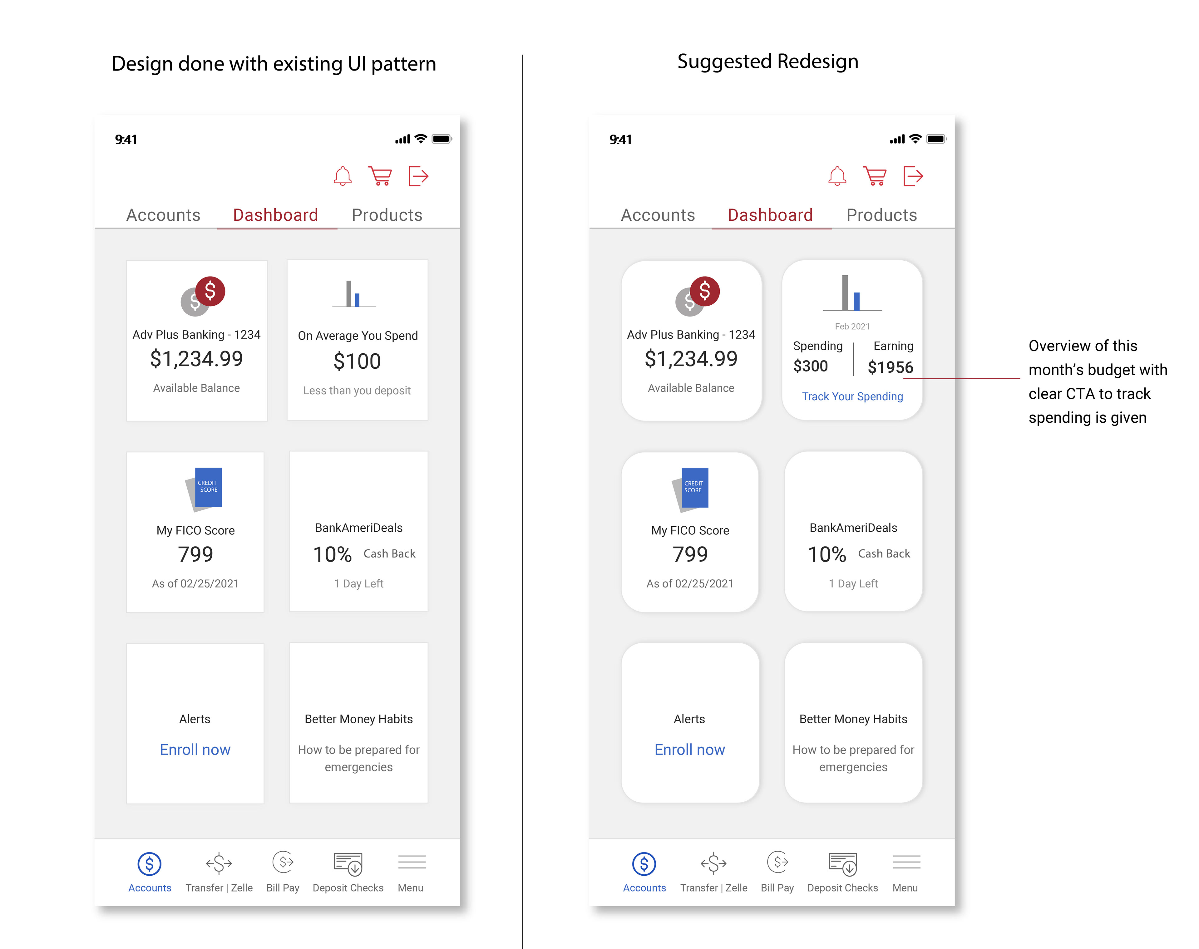 Budgeting Accessibility: The existing dashboard screen doesn't readily display budgeting options. To address this, I propose a redesigned version featuring a clear call to action (CTA) for tracking spending, along with a helpful overview of the user's monthly budget.