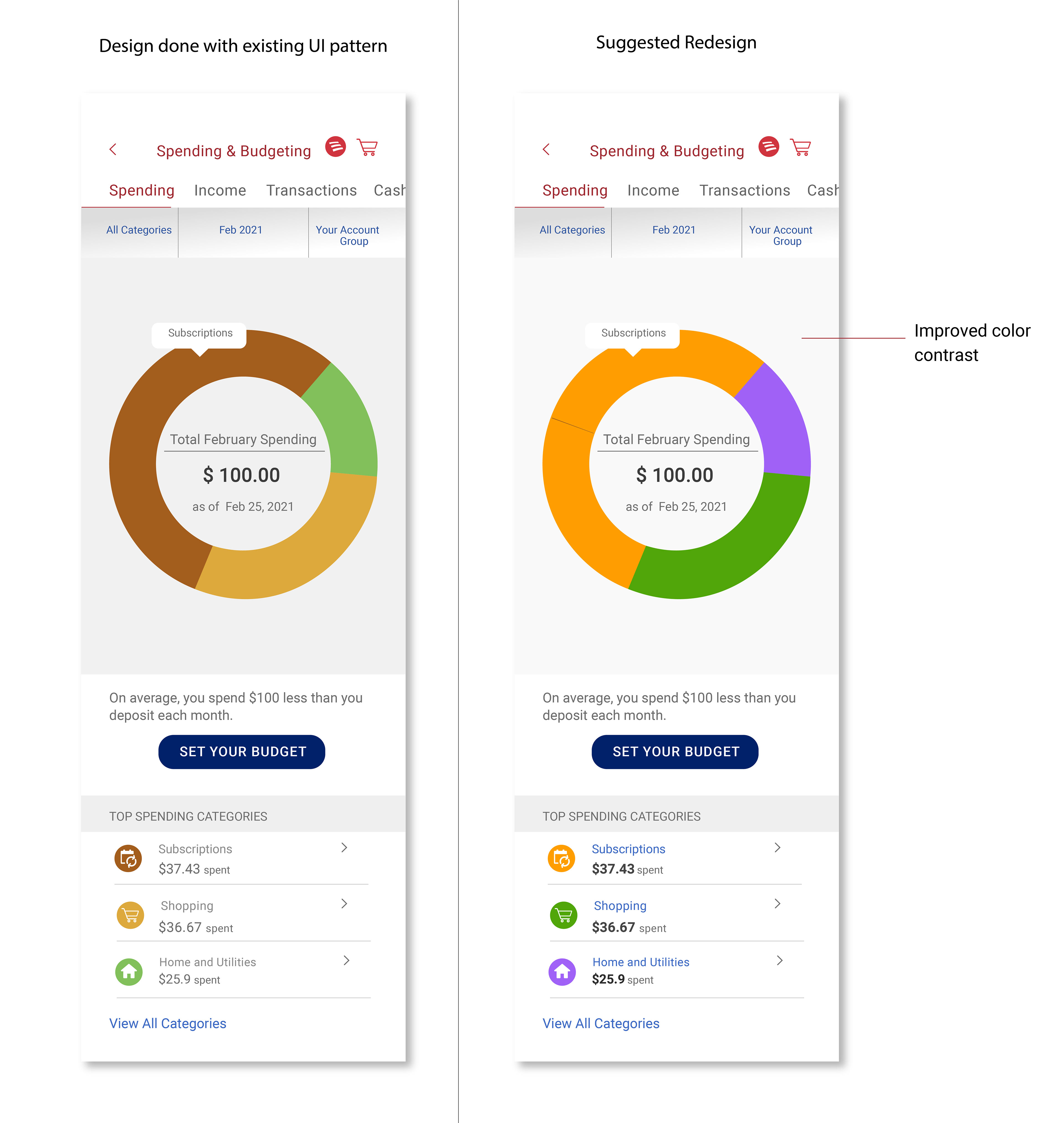 Color Contrast Deficiency: The current spending and budgeting chart uses colors with low contrast, potentially hindering users with color blindness. Good color contrast is crucial for usability and readability, so the redesign incorporates a color palette that ensures accessibility for all users.