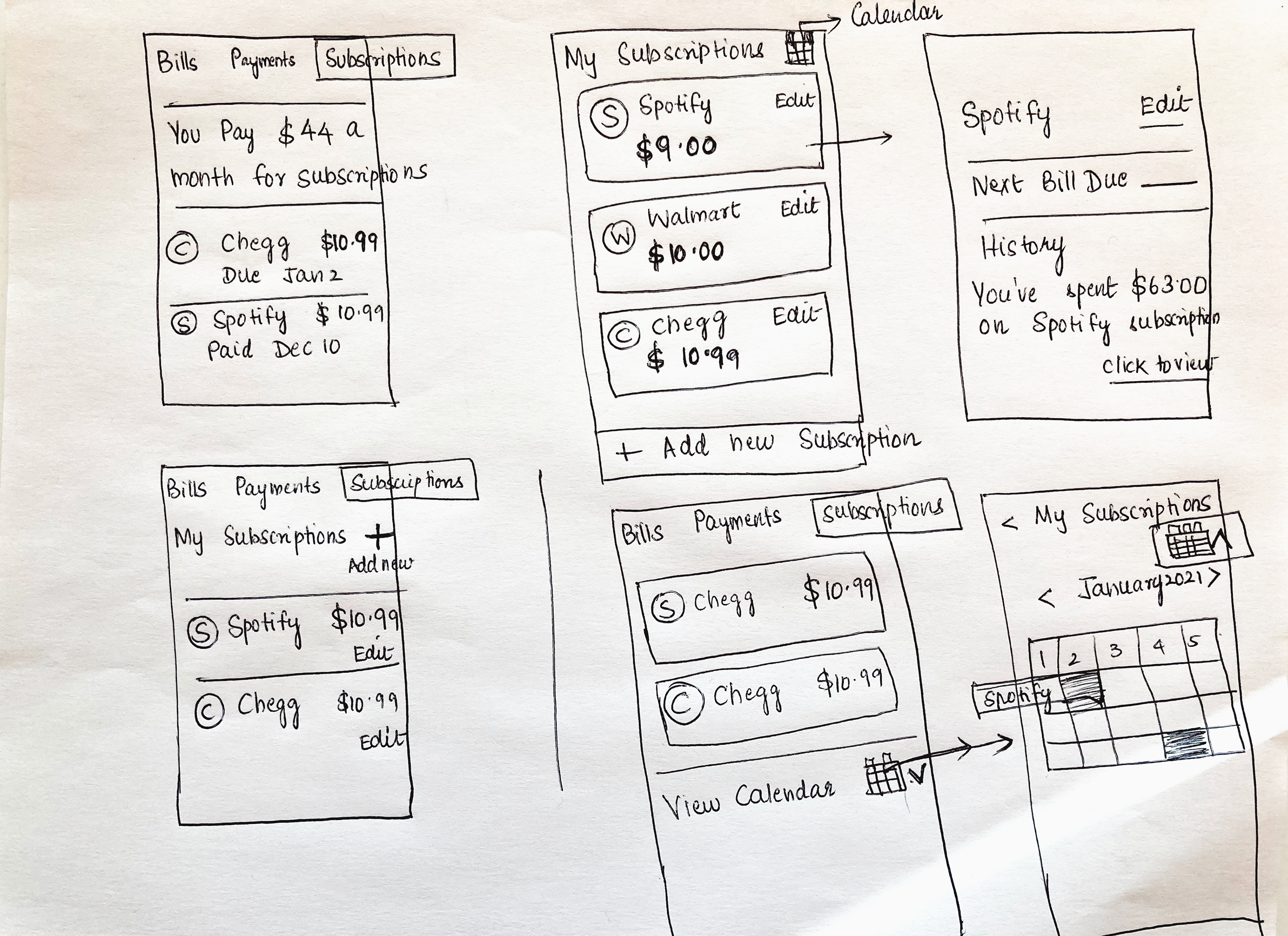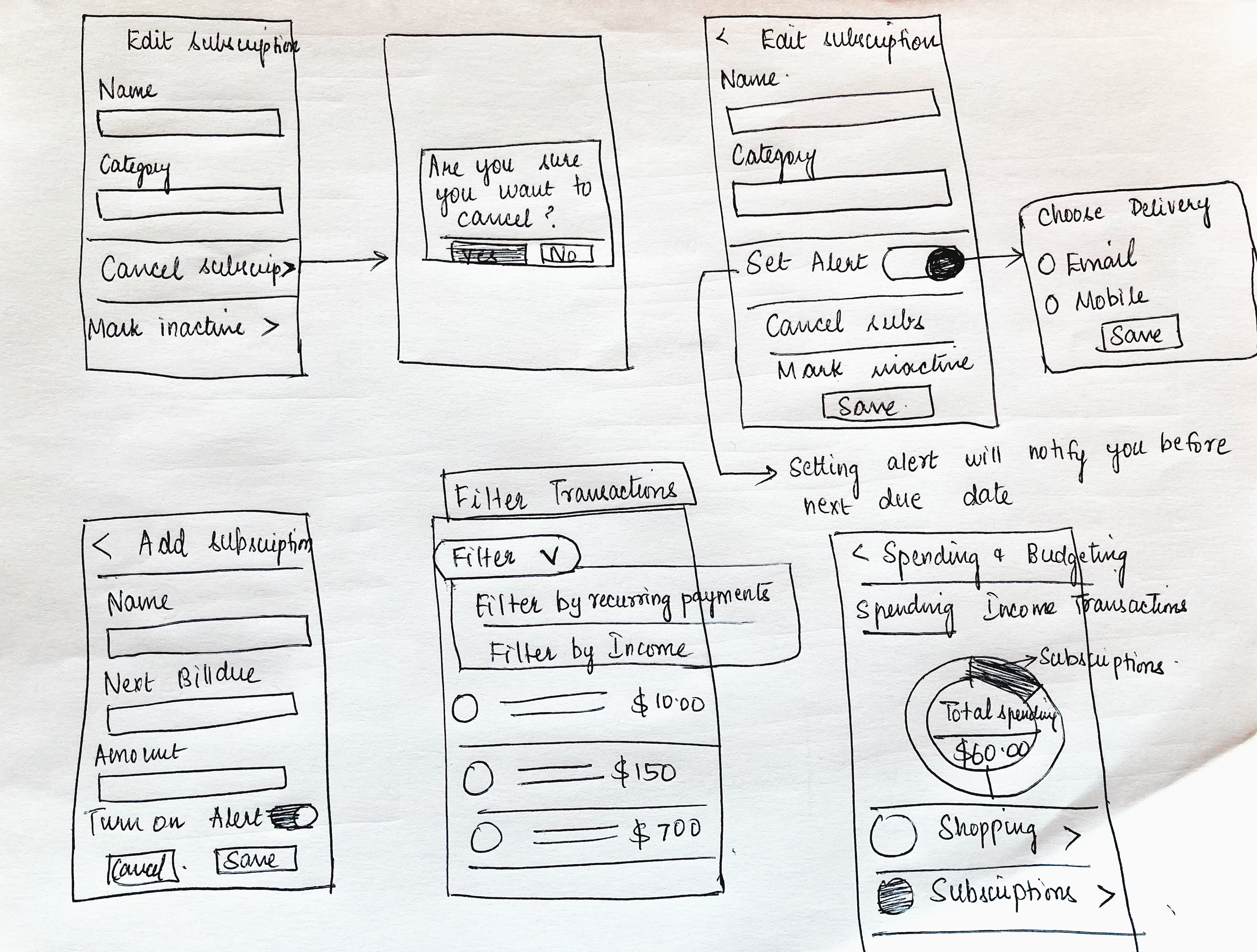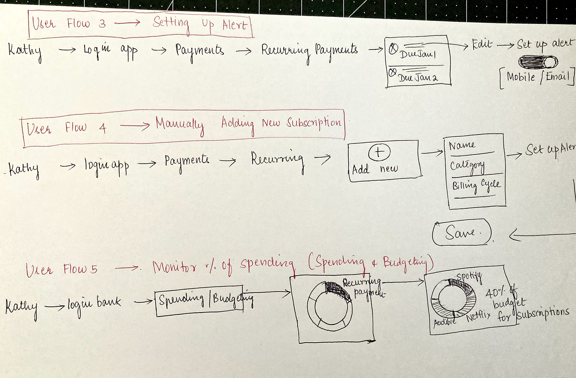 Mapping the User Journey: To understand how users would navigate the app to achieve the five micro-goals, I delved into existing apps like TrueBill and Intuit, analyzing their interface and user flows. This research served as a blueprint as I sketched out five user flows for the Bank of America app. Each flow mapped a goal (e.g., track subscriptions) to its starting point (e.g., a dedicated "Subscriptions" tab) to ensure a seamless user experience.