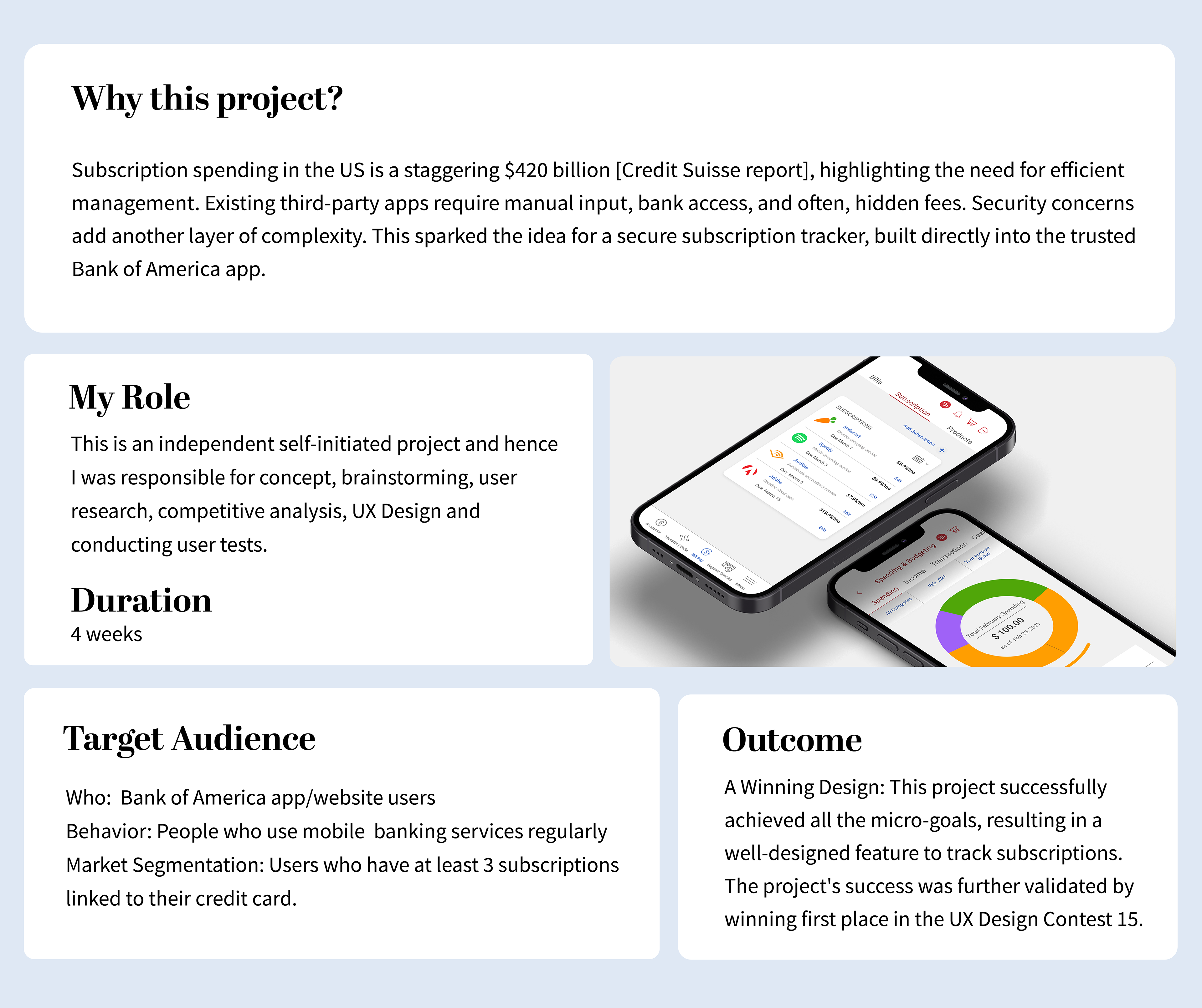 Bank of America, a trusted financial institution with robust security, presented the perfect platform. Integrating a subscription tracker would keep users in control:
