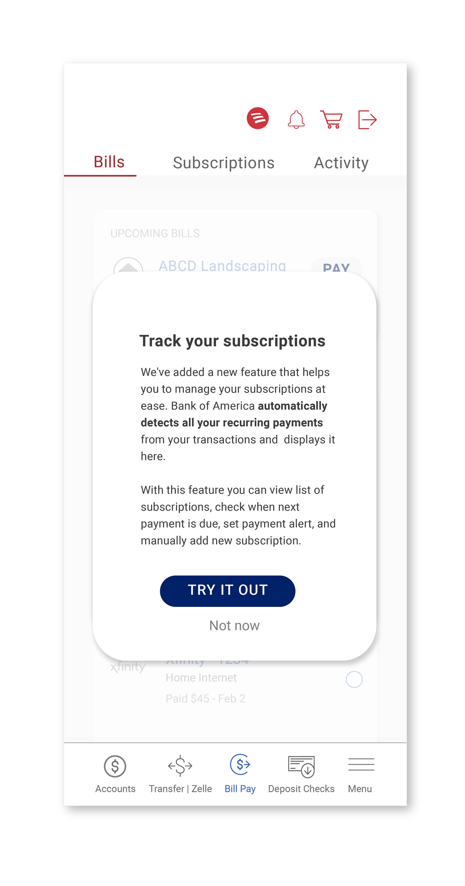 Placing the feature for maximum impact was crucial. Hiding it within transaction filters wouldn't do. To ensure easy discovery and drive user engagement, I analyzed how BOA and other financial apps categorize features. This led to the decision to position the subscription tracker as a clear tab under "Bill Pay." This location aligns with users' expectations and makes it readily accessible.