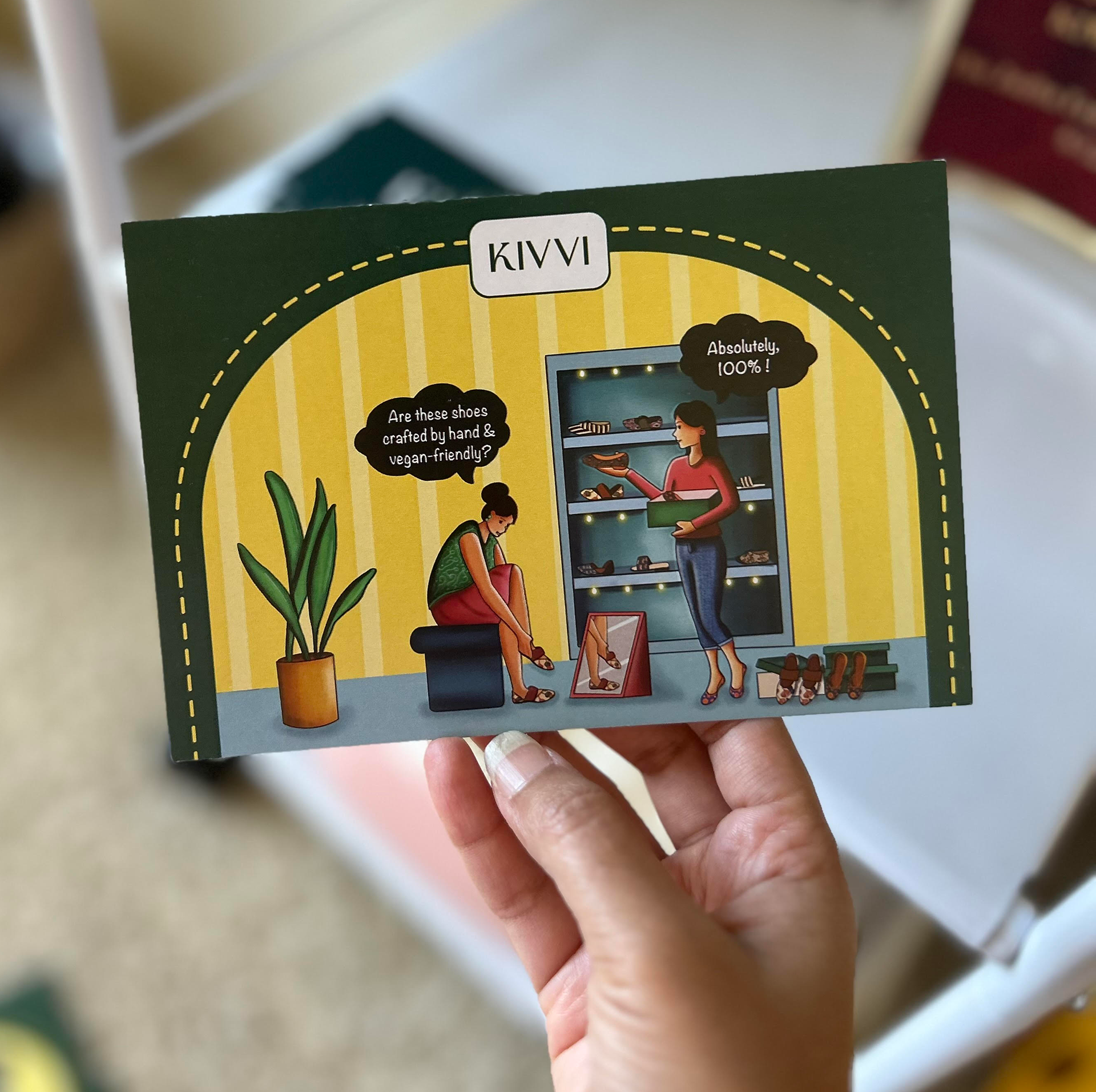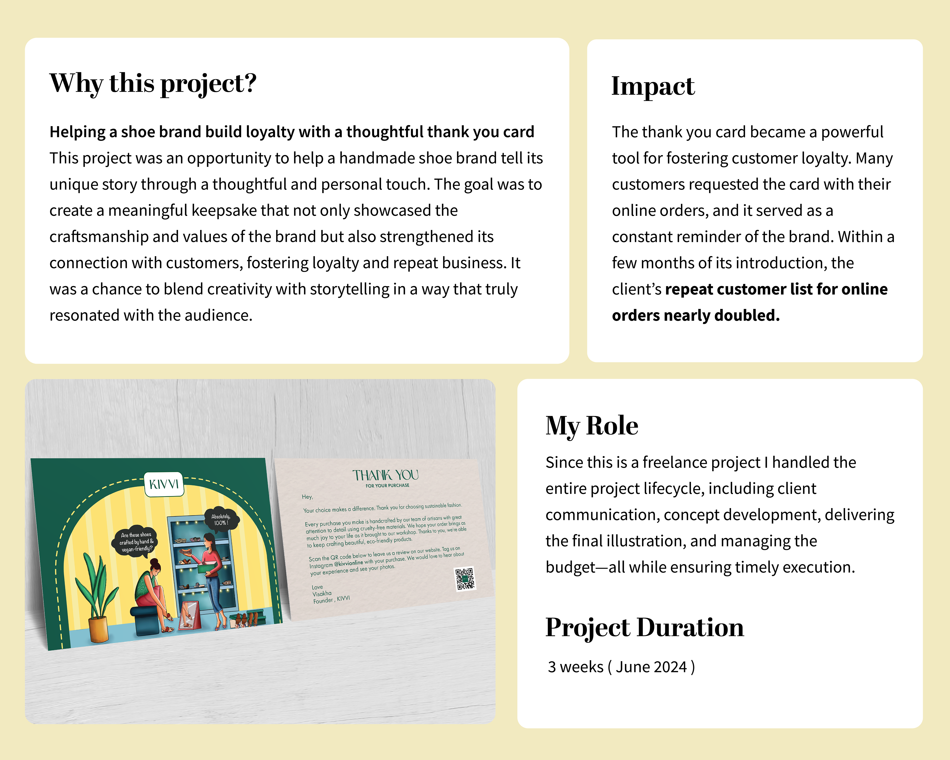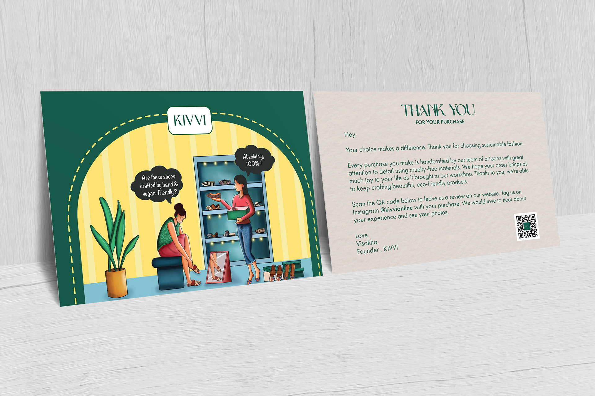 We considered branded gifts like notebooks, planners but chose a custom “Thank You Card” to accompany each purchase. The illustrated card highlights Kivvi Shoes’ handmade process and personal touch, designed as a keepsake to remind customers of the brand and encourage repeat business.
