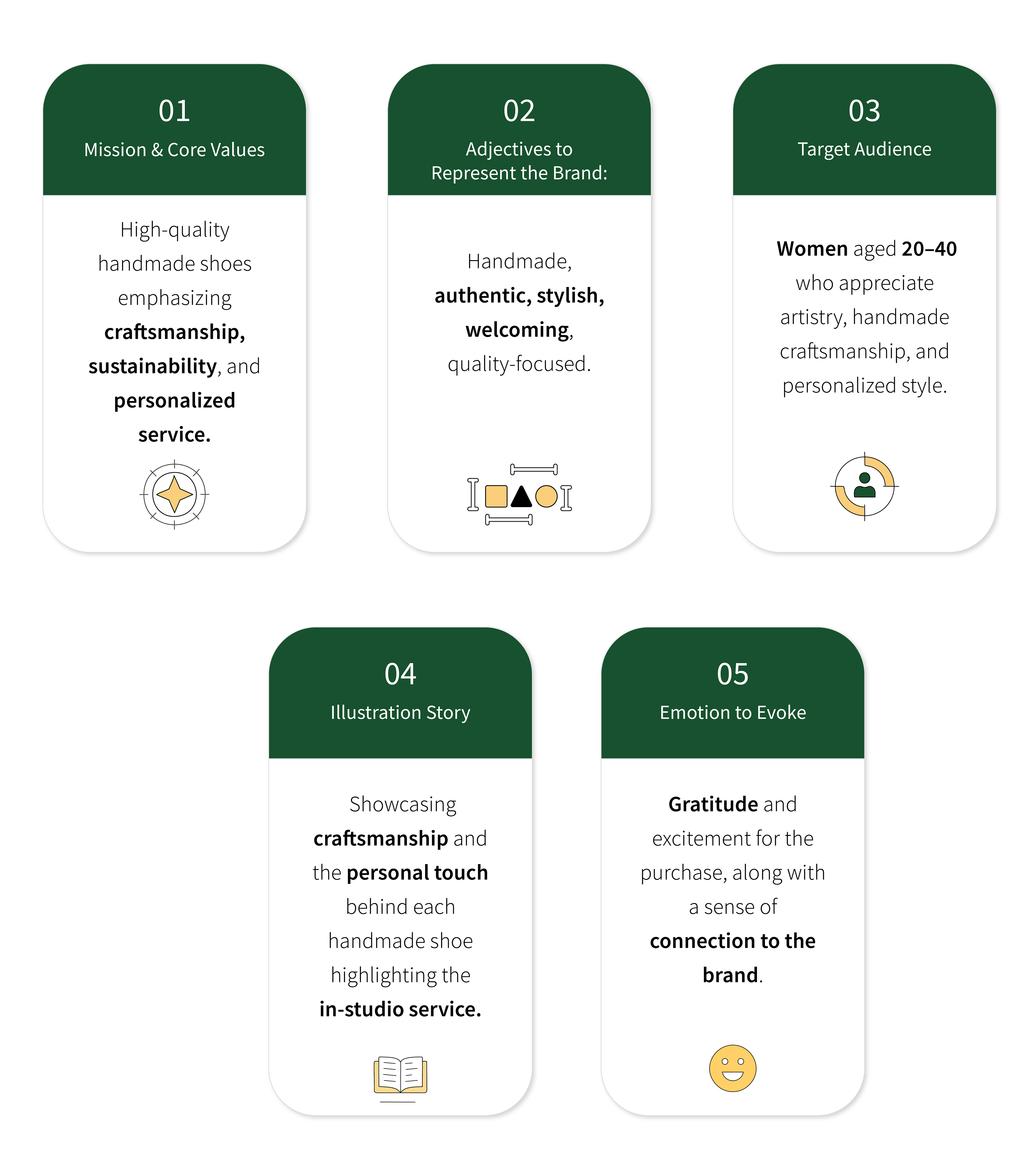 Out of these options, the client was drawn to the concept of showcasing her home studio, as she wanted to emphasize studio visits and highlight the customer service and collection of shoes she offers.