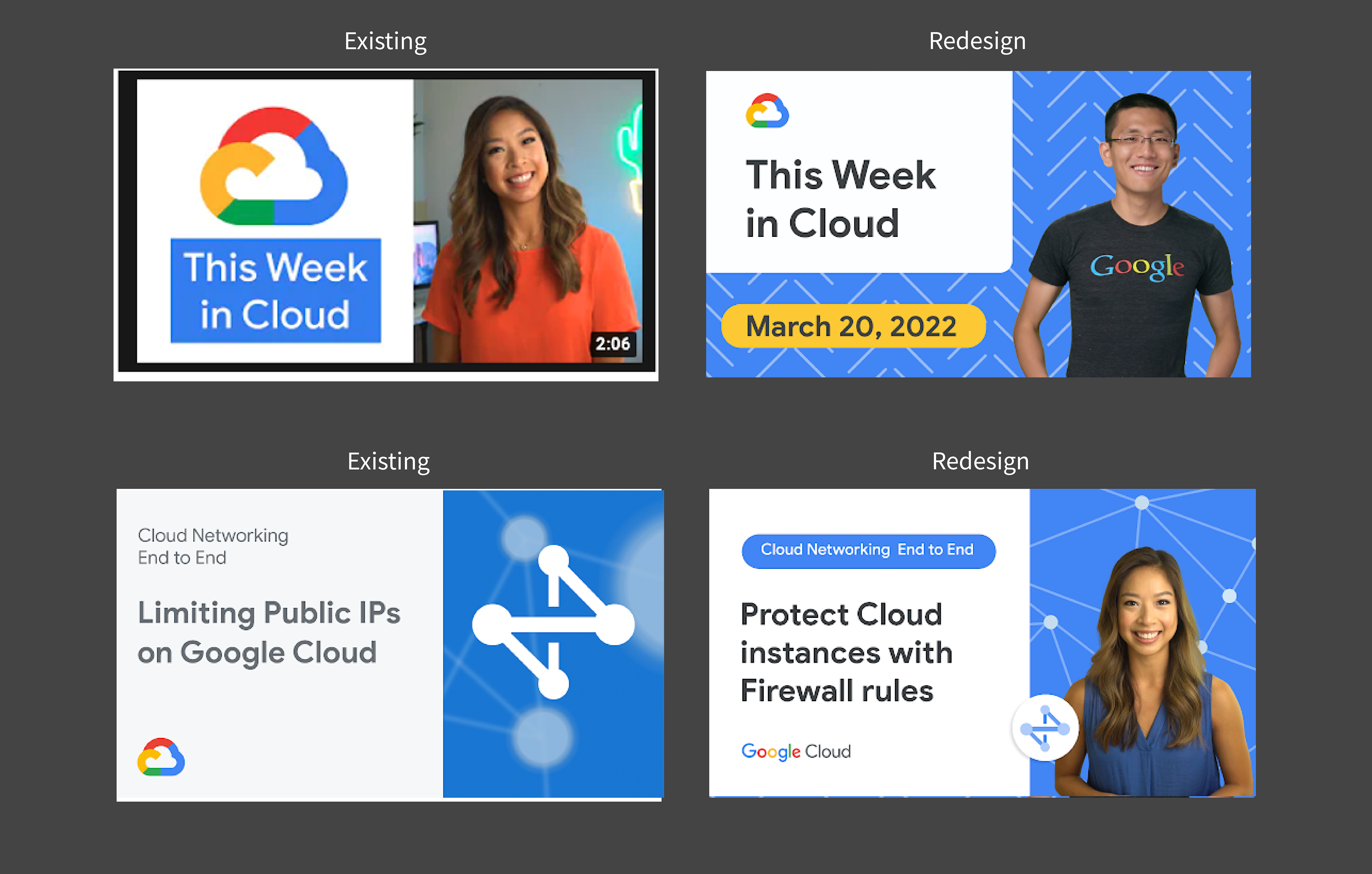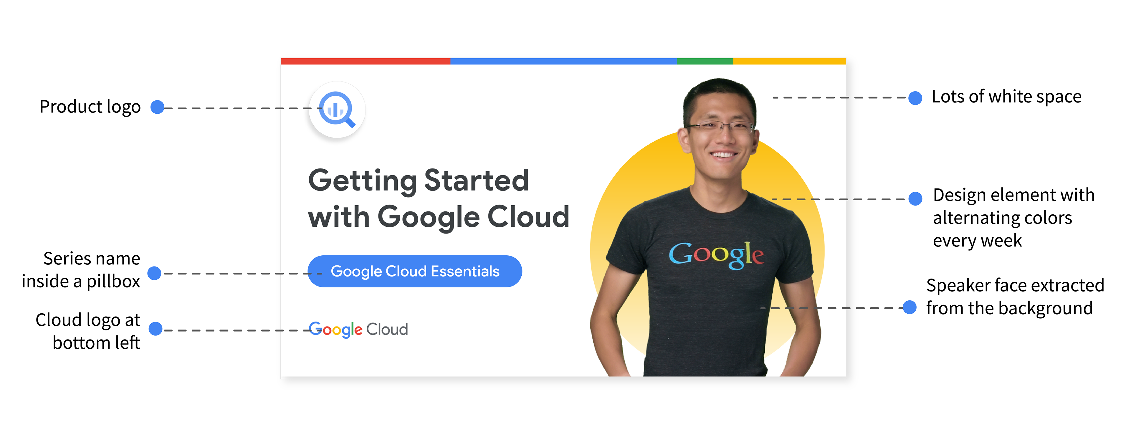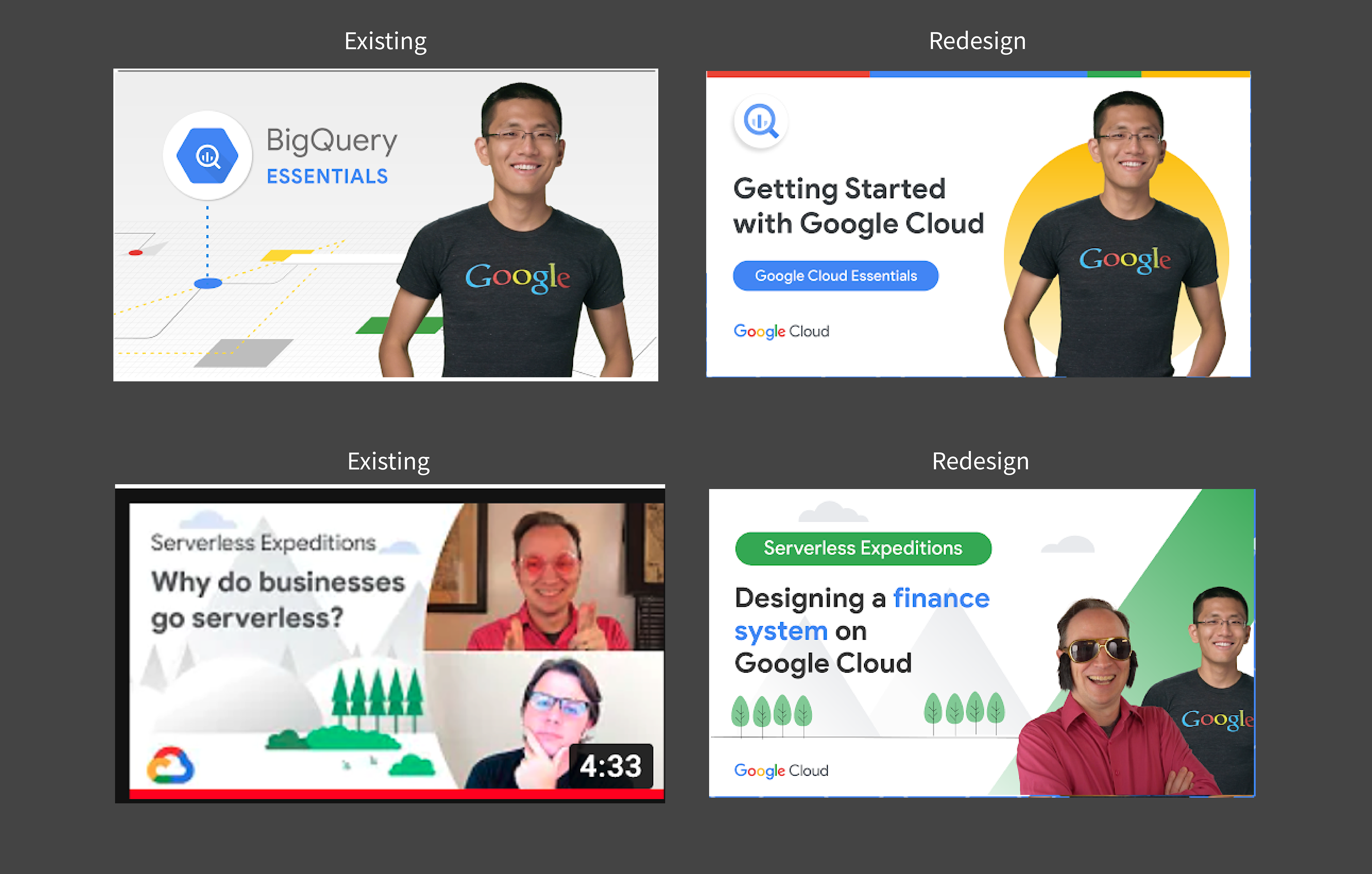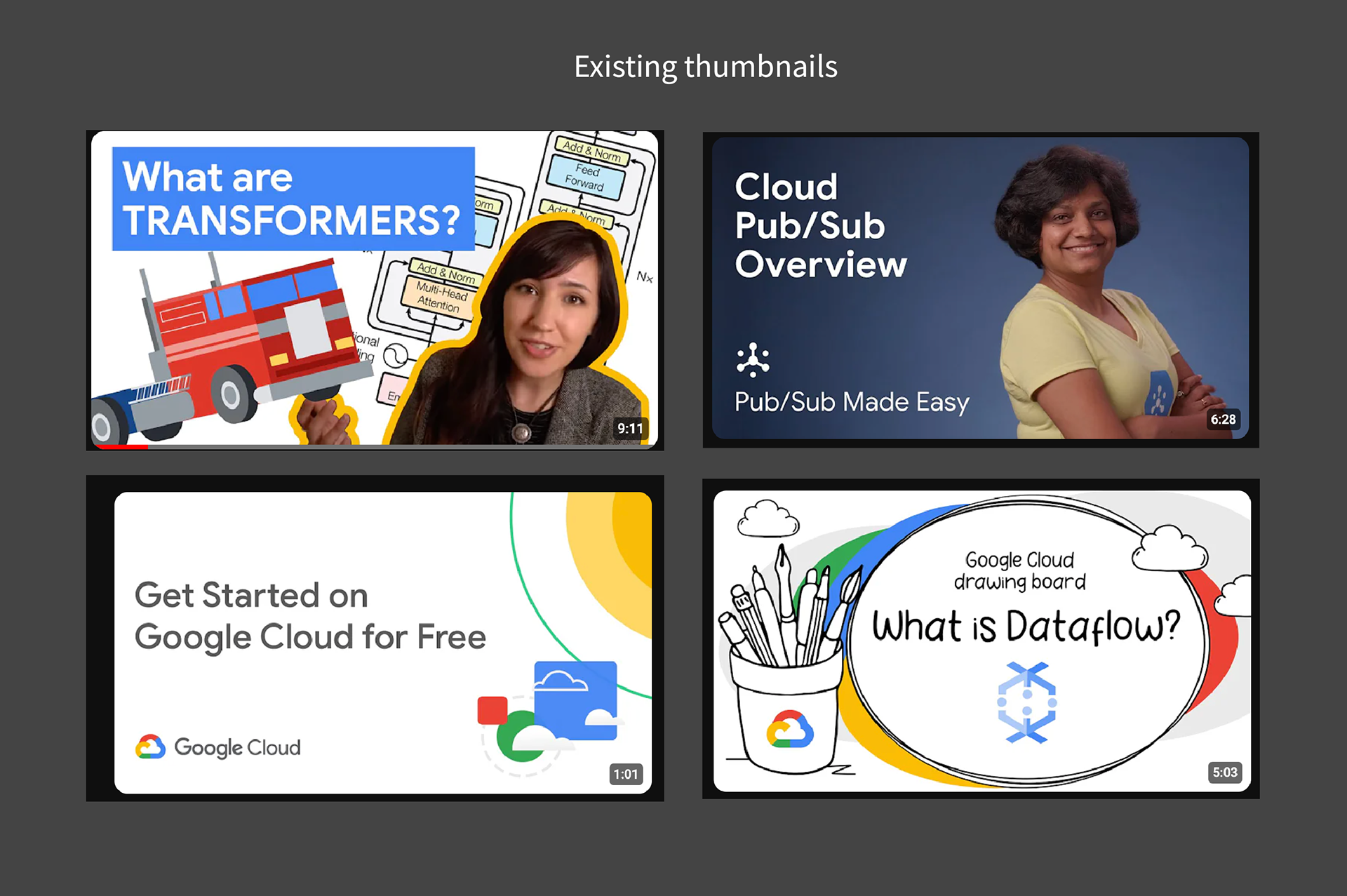 With a solid understanding of what worked, we built a foundational template structure. Design elements and colors could be easily swapped to create diverse templates. Additionally, the iconic Google color palette offered a weekly rotation option for series thumbnails.