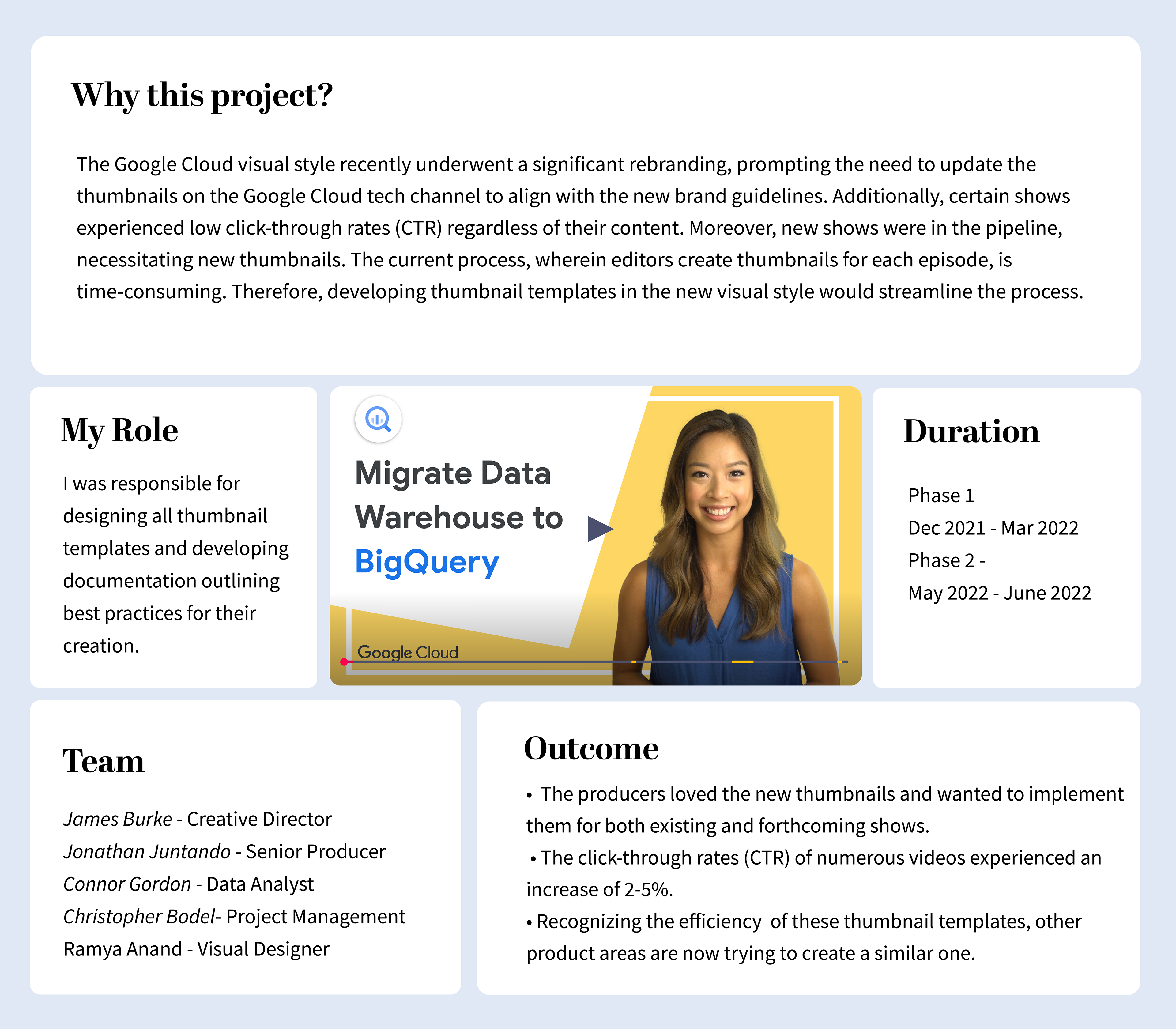 This project holds significance as it marks the first major task assigned to me upon joining the Google for Developers team at Google. With Google Cloud undergoing a significant rebrand, it was time to revamp all assets, including thumbnail templates, illustration library, and motion graphics. Experiencing a mix of nervousness and excitement, I aimed to make a stellar first impression within the team.